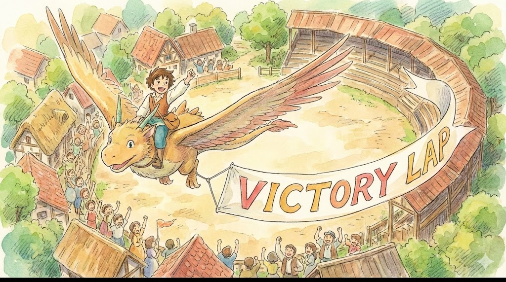 - 해석: 경주에서 이긴 후 관중에게 감사하며 트랙을 한 바퀴 도는 행위, 또는 성공 후의 축하 행위.