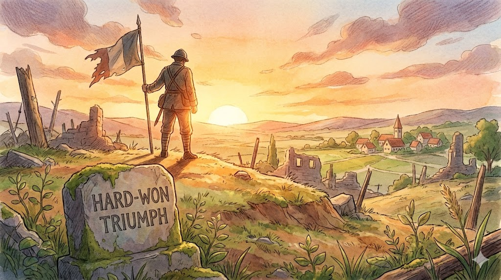 길고 험난했던 전쟁, 투쟁, 또는 경쟁의 끝을 맺는 결정적이고 궁극적인 승리를 의미합니다. 더 이상의 싸움이나 의문이 없는 완전한 해결을 강조합니다.