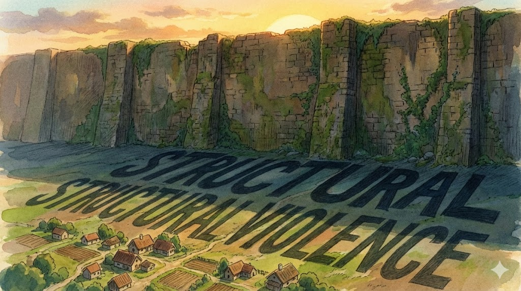 - 지문은 단순히 눈에 보이는 신체적 폭력뿐만 아니라, 구조적 폭력(structural violence)(빈곤, 차별)처럼 사회 시스템에 의해 야기되는 간접적 피해를 논합니다. 이 개념은 사회적 책임과 제도 개혁의 필요성을 강조합니다.