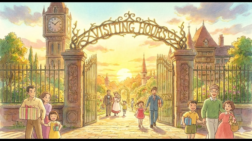 병원, 교도소, 요양원 등에서 방문객이 환자나 수감자 등을 만날 수 있도록 정해진 시간대를 의미합니다. 질서와 관리를 위해 설정된 시간 제한을 강조합니다.