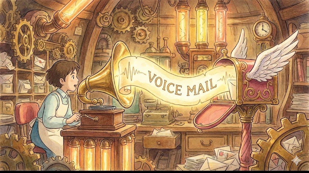 전화 통화가 연결되지 않거나 수신자가 부재 중일 때, 발신자의 음성 메시지를 녹음하여 저장해 두는 시스템을 의미합니다. 비동기식(asynchronous) 소통 수단입니다.