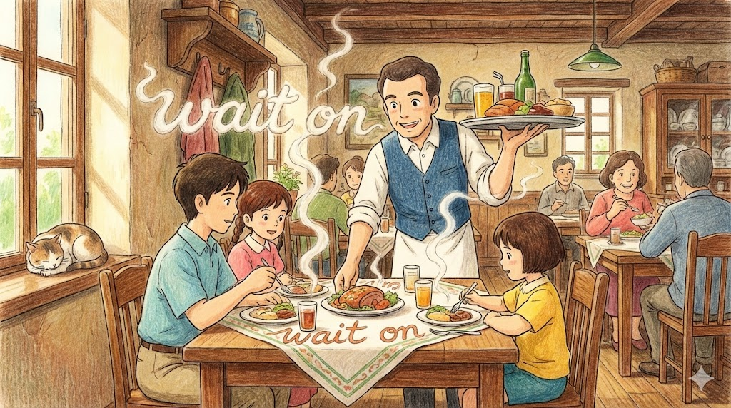 | on | ~을 위해 (시중들다) | 전치사로, '봉사'. | '식당' '등에서' '누군가' '의' '필요' '를' '위해' '대기' '하며' '서비스' '를' '제공' '함을' '의미함'. |