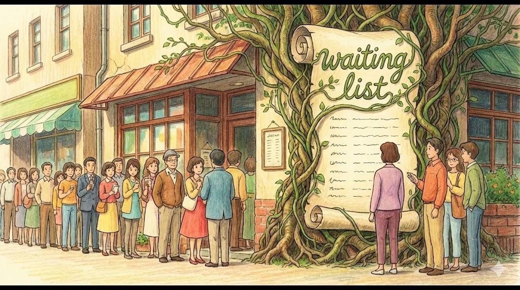 정원 초과, 품절, 혹은 시간이 맞지 않아 즉시 이용하거나 받을 수 없는 서비스, 상품, 또는 기회를 기다리는 사람들의 명단을 의미합니다. 수요가 많거나 공급이 부족할 때 발생합니다.