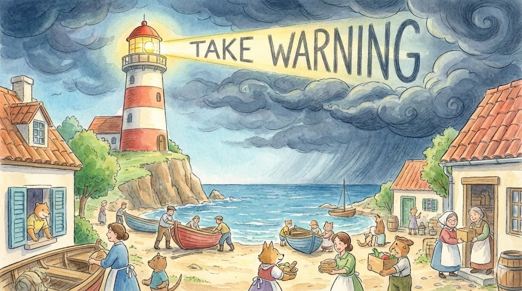 - We must take warning and prepare for the storm. (우리는 경고를 받아들이고 폭풍에 대비해야 한다.)