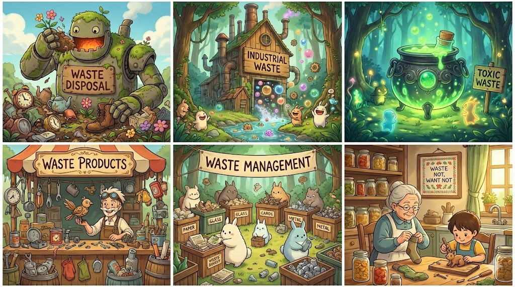 'waste disposal'은 처리 행위를, 'industrial/toxic waste'는 폐기물의 종류를, 'waste management'는 체계적 관리를, 'waste not, want not'은 절약 정신을 나타냅니다.