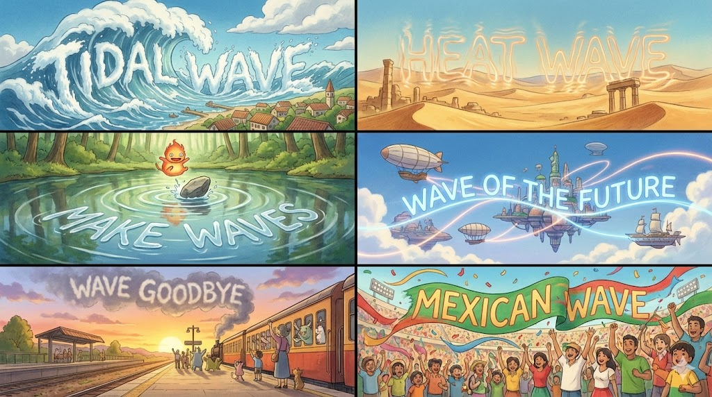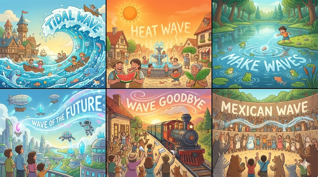 tidal wave, heat wave, make waves, wave of the future, wave goodbye, Mexican wave