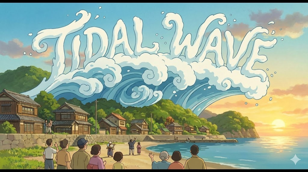 - 해석: 지진 등으로 인해 발생하는 매우 큰 파도 (츠나미), 또는 (비유적) 압도적인 규모의 사건이나 현상.