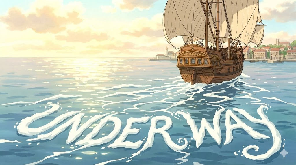어떤 계획, 프로젝트, 또는 활동이 이미 시작되어 지속적으로 이루어지고 있는 상태를 의미합니다. 원래 배가 닻을 올리고 항해를 시작했다는 해상 용어에서 유래했습니다.