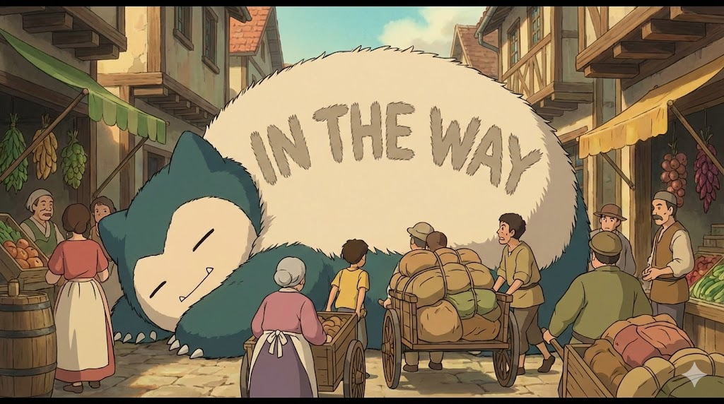 - Your large suitcase is in the way of the door. (당신의 큰 여행 가방이 문 앞을 막고 있다(방해가 된다).)