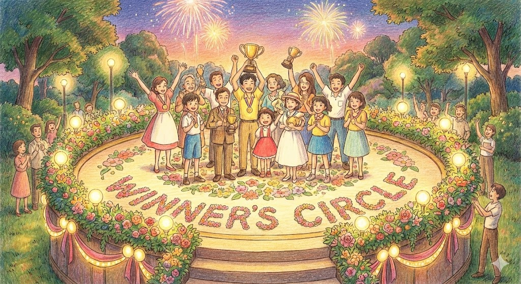 경마에서 우승마가 들어서는 시상 공간을 의미합니다. 비유적으로는 가장 성공하고 인정받는 사람들(winner's) 그룹이나 지위(circle)를 의미하며, 명성과 특권을 상징합니다.
