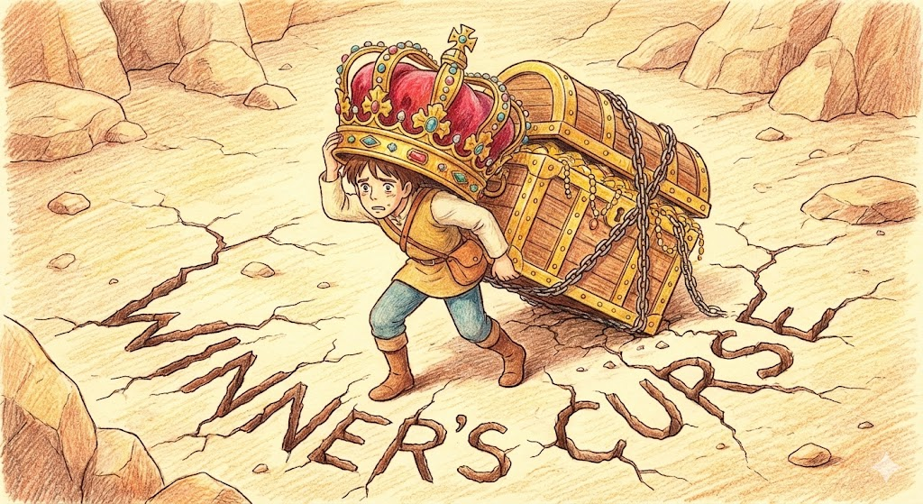 경매나 인수합병(M&A) 등 경쟁 입찰 상황에서, **가장 높은 가격을 제시하여 (경쟁에서) 승리한 사람(winner)**이 실제 가치보다 너무 비싸게 사서 장기적으로 손해를 보는 현상을 의미합니다. 일시적인 승리가 장기적인 패배(저주)로 이어짐을 비유합니다.