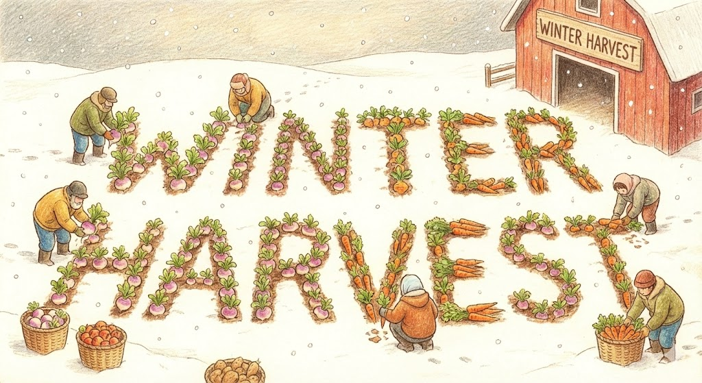 추운 겨울(winter) 기후를 견디고 그 시기에 재배되어 수확되는 작물(예: 케일, 브로콜리, 일부 감귤류)이나 그 수확 행위를 의미합니다. 혹한기에 식량을 확보하는 중요한 농업 활동입니다.