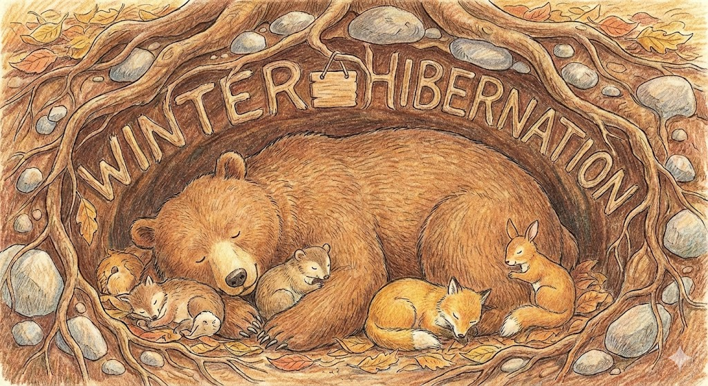 곰이나 다람쥐 같은 동물이 **겨울(winter)**철의 낮은 기온과 먹이 부족을 견디기 위해 신진대사를 극도로 낮추고 잠에 빠지는 생물학적 상태를 의미합니다. 'Deep sleep'과는 다른, 장기간의 생리적 변화입니다.