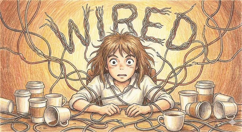 - 예문: He was too wired after drinking espresso late at night to fall asleep. (그는 밤늦게 에스프레소를 마신 후 너무 흥분해서/각성해서 잠들 수 없었다.)
