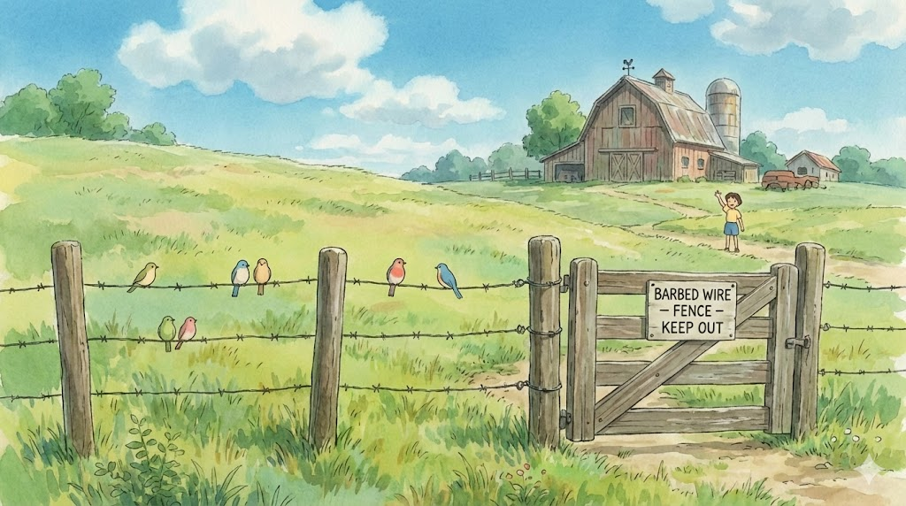 날카로운 가시(barbs)가 달려 있는 철사(wire) 를 꼬아서 만든 것으로, 주로 농장이나 경계 지역에서 침입자를 막기 위해 울타리로 사용되는 재료입니다. 방어와 경계의 의미를 내포합니다.