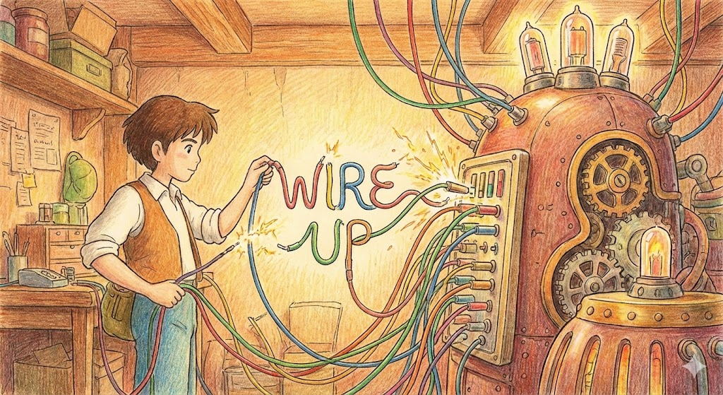 - 예문: The electrician spent the whole day wiring up the new security camera system. (전기 기사는 하루 종일 새 보안 카메라 시스템을 배선하는 데 보냈다.)