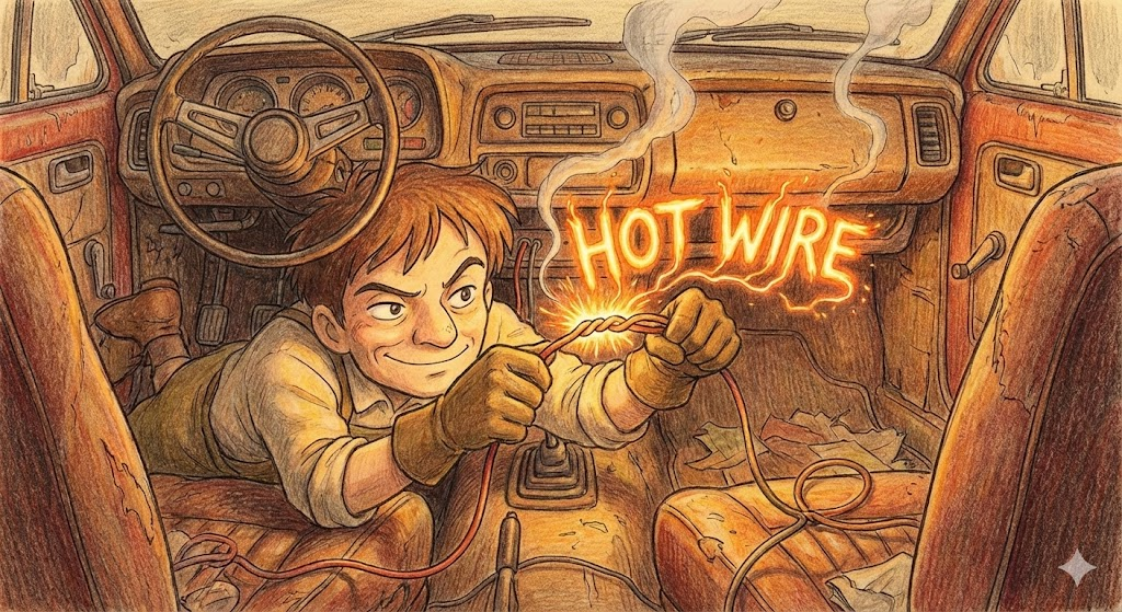 - 예문: The thief attempted to hot wire the classic car but failed. (그 도둑은 클래식 자동차의 시동을 불법적으로 걸려 했지만 실패했다.)