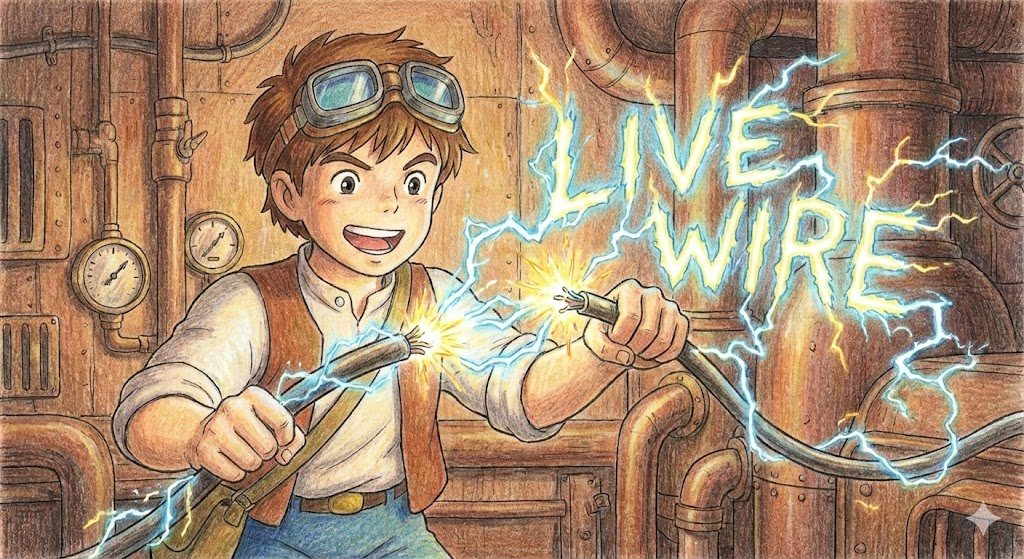 - 해석: 전류가 흐르고 있어 위험한 전선, 또는 (비유적) 매우 활기차고 에너지 넘치는 사람.