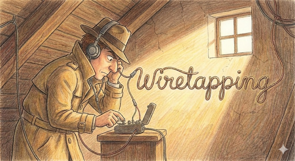 전화선(wire)을 몰래 도청(tapping)하여 통신 내용을 듣거나 기록하는 행위를 의미합니다. 주로 수사 기관에서 법적 절차를 거쳐 행하거나, 불법적으로 사생활을 침해할 때 사용됩니다.