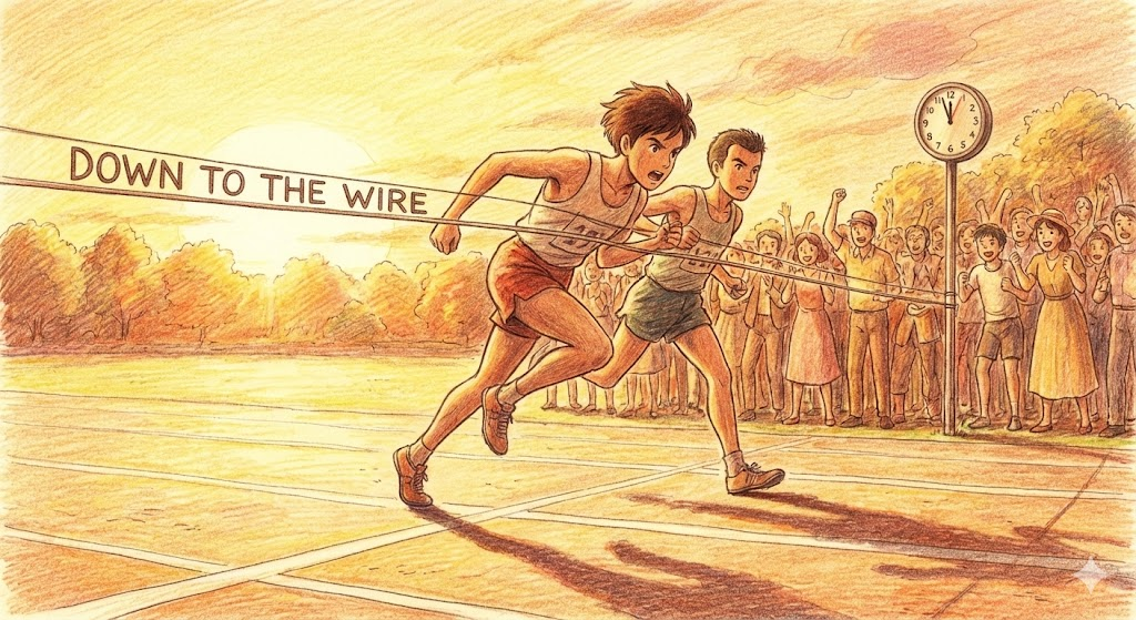 - 해석: 결과나 마감 시간이 마지막 순간에 가서야 결정될 정도로 매우 긴박하고 근접한 상태. (경쟁, 마감 지문에서 중요)