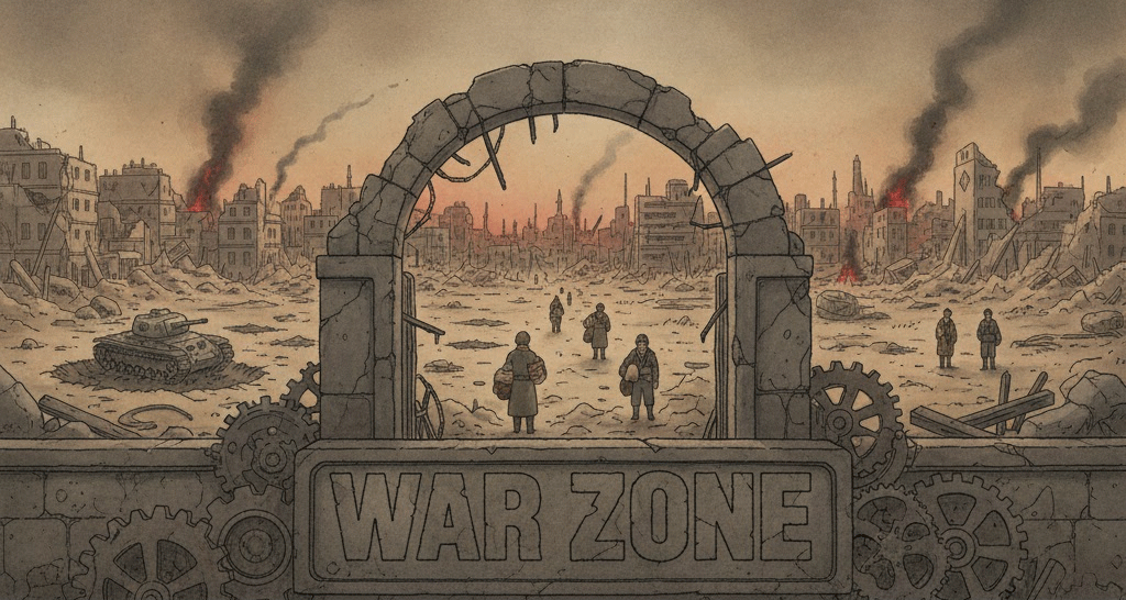 해석: 전쟁이 벌어지고 있는 위험한 지역을 의미합니다.