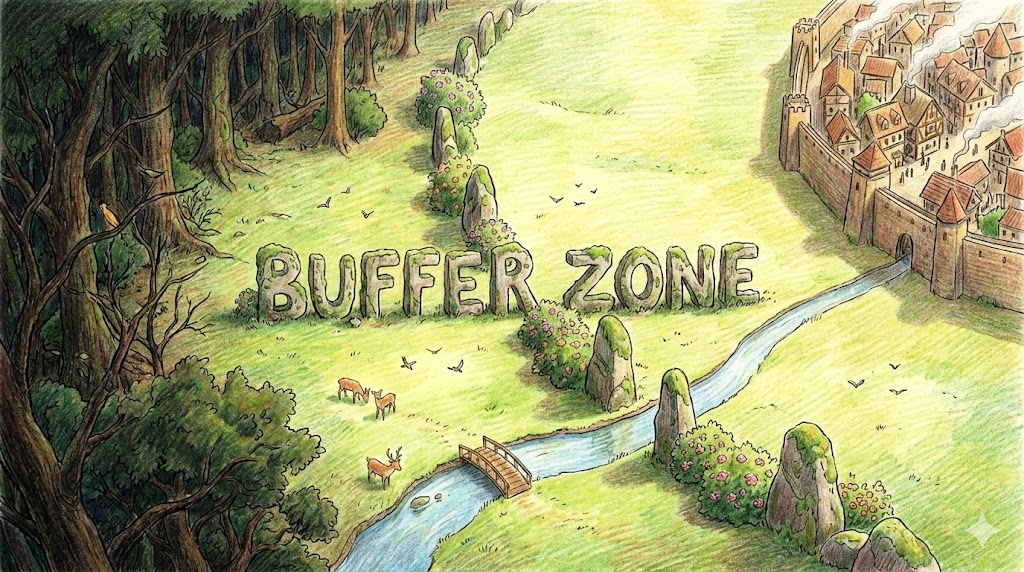 서로 적대적이거나 성격이 다른 두 지역 사이에서 충돌을 방지하기 위해 설정된 중립적인 구역을 의미합니다. 물리적인 거리뿐만 아니라 심리적, 환경적 보호 구역의 의미로도 사용됩니다.