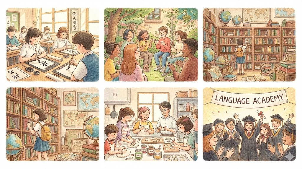 외국어를 전문적으로 가르치는 사설 교육 기관을 의미합니다. 회화, 문법, 자격증 시험 대비 등을 목적으로 하며, 한국의 '영어 학원'이나 해외의 '랭귀지 스쿨'을 지칭할 때 쓰입니다.