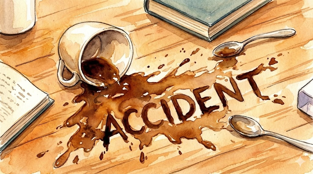 사고, 우연성. 의도치 않게 발생한 불행한 사건이나 계획되지 않은 상황.