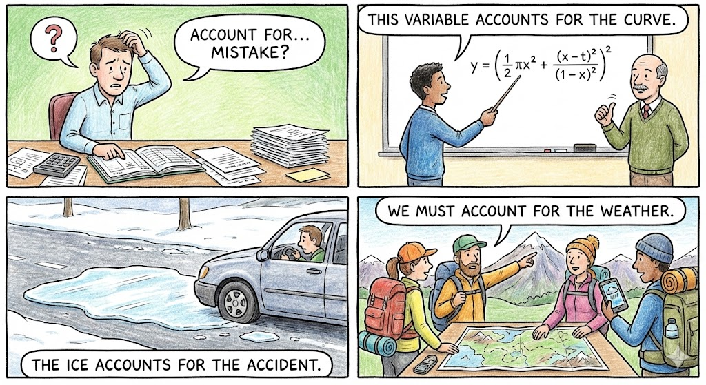 'bank account'는 금융 계좌를, 'account for'는 설명이나 비율 차지를, 'take into account'는 고려를, 'by all accounts'는 평판을, 'settle an account'는 빚이나 원한의 청산을 나타냅니다.