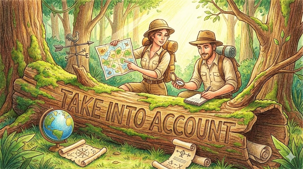예문: We must take into account the weather conditions before starting the hike. (우리는 등산을 시작하기 전에 날씨 조건을 고려해야 한다.)