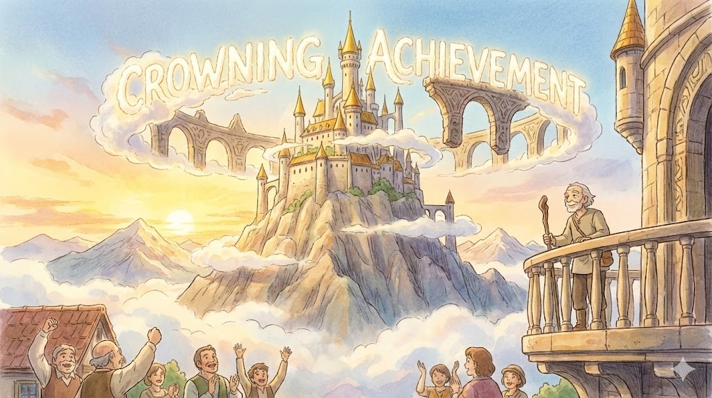 인생이나 경력에서 가장 훌륭하거나 중요한 성공을 의미합니다. 왕관(crown)을 씌우듯이 일련의 노력을 화려하게 마무리하거나 가장 빛나는 정점을 찍는다는 뜻을 담고 있습니다.