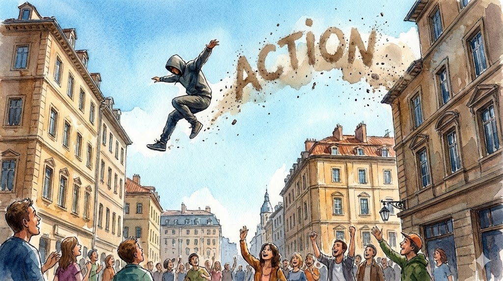 | 종합 뉘앙스 | (1) 생각이나 말에 그치지 않고 실제로 무언가를 행하는 과정. (2) 법적인 절차를 밟는 행위(소송). (3) 영화나 이야기 속의 격렬한 움직임. | '실행 과정 또는 움직임' |