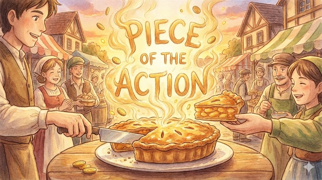 - 해석: 어떤 활동이나 사업의 이익, 혹은 흥미로운 일에 일부분으로 참여하는 것을 비유합니다.
