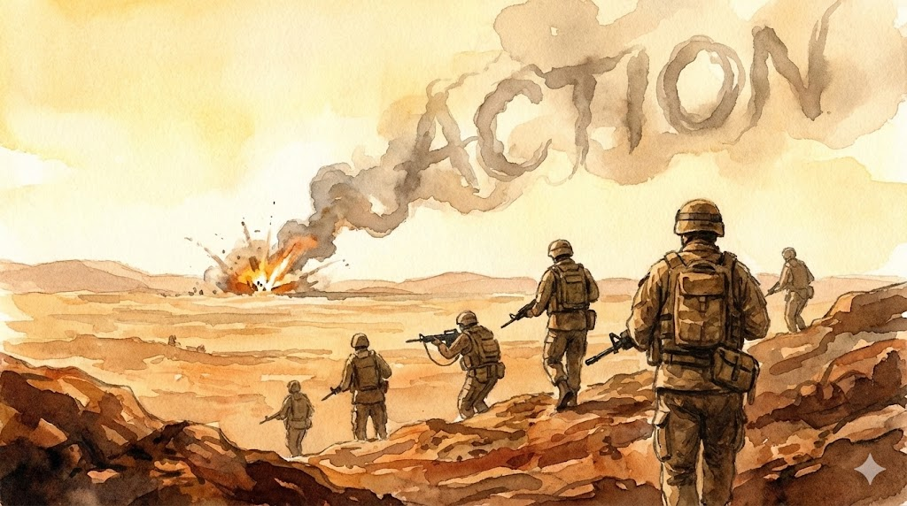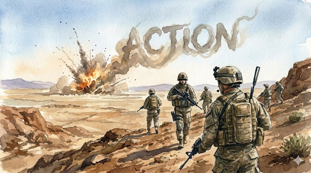 | 명사 (N.) | 전투 | (Killed in action) 군사 작전이나 싸움. | The soldier was wounded in action. (그 군인은 전투 중에 부상을 입었다.) |