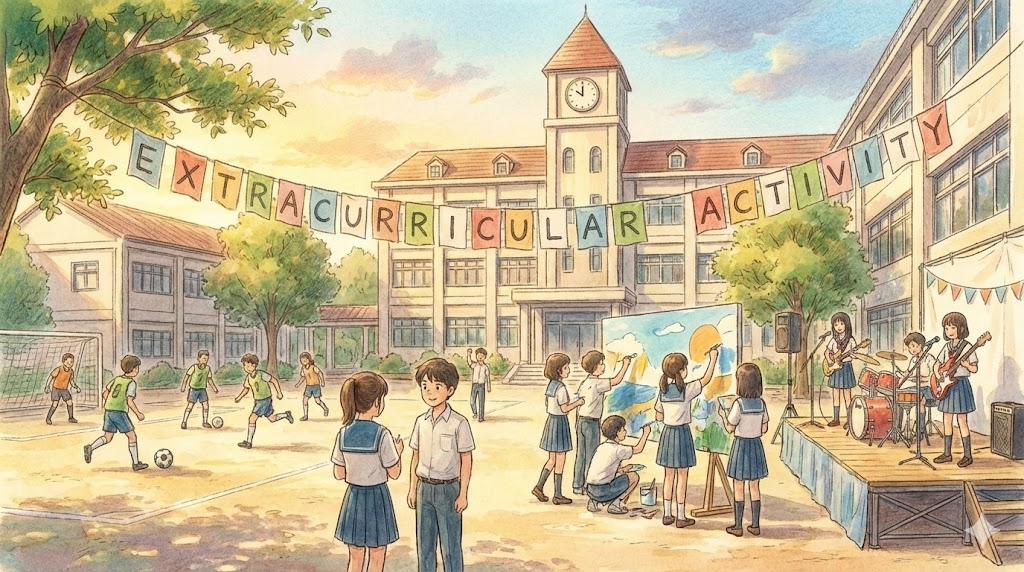 정규 교육 과정(수업) 외에 학생들이 학교나 대학에서 참여하는 동아리, 스포츠, 봉사 등의 활동을 의미합니다. 학업 외의 재능이나 사회성을 기르는 데 중요하게 여겨집니다.