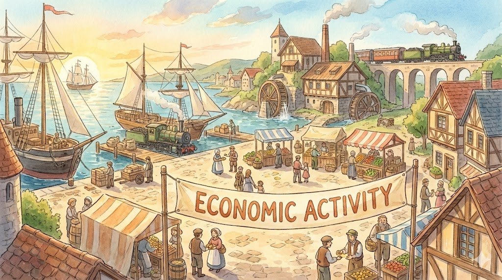 - 해석: 재화나 서비스를 생산, 유통, 소비하는 것과 관련된 사회적 움직임의 총체입니다.