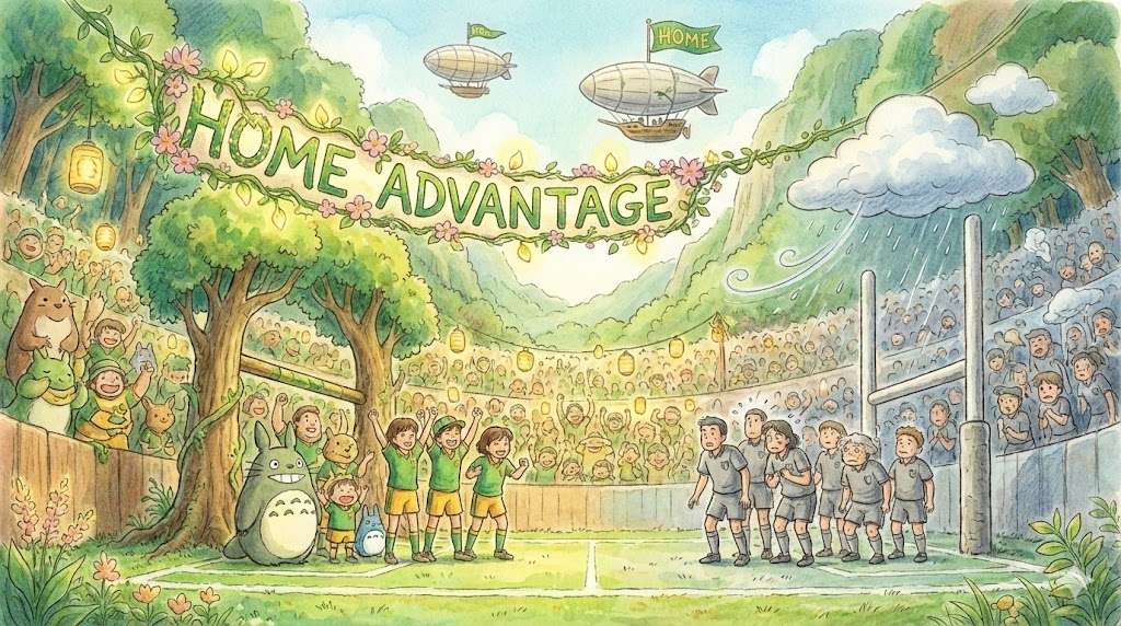 스포츠 경기에서 자기 팀의 연고지(홈 경기장)에서 경기할 때 얻는 유리함을 말합니다. 관중의 응원, 익숙한 환경, 이동 피로 없음 등이 포함됩니다.