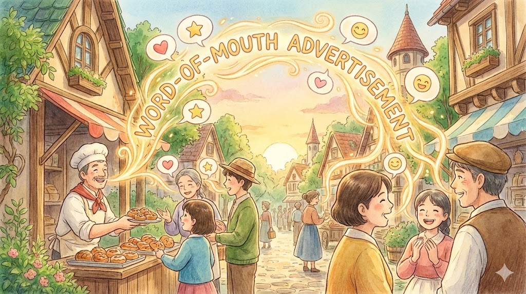 word-of-mouth advertisement [wɜːrd əv maʊθ ˌædvərˈtaɪzmənt]