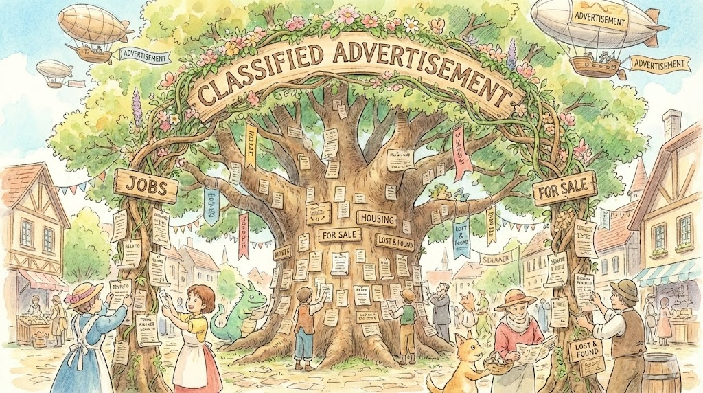 - 해석: 신문 등에서 주제별(구인, 부동산, 중고 거래 등)로 분류하여 짧게 싣는 소형 광고입니다.