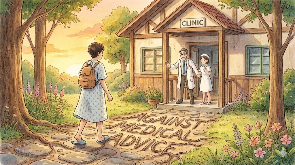 - 해석: 주로 환자가 의사의 지시나 치료 권고를 따르지 않고 병원을 나가는 상황에서 쓰입니다.