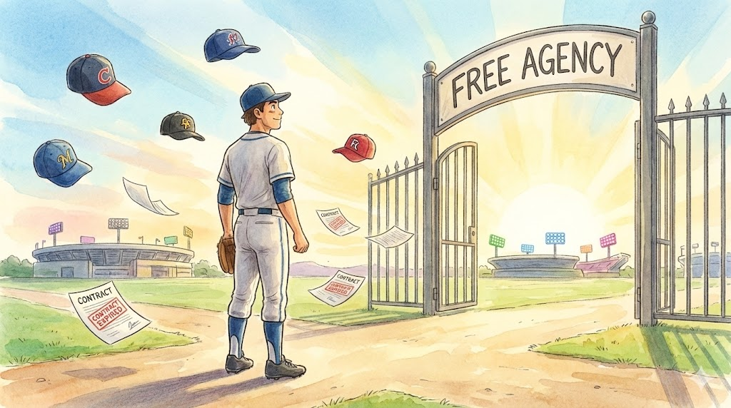 - 예문: The star player entered free agency hoping for a bigger contract. (그 스타 선수는 더 큰 계약을 바라며 자유 계약 시장에 나왔다.)