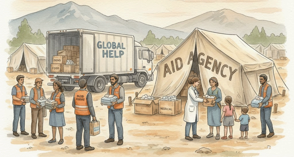 전쟁, 기근, 자연재해 등으로 고통받는 사람들에게 식량, 의료, 자금 등을 지원하는 국제기구나 비정부 기구(NGO)를 의미합니다.