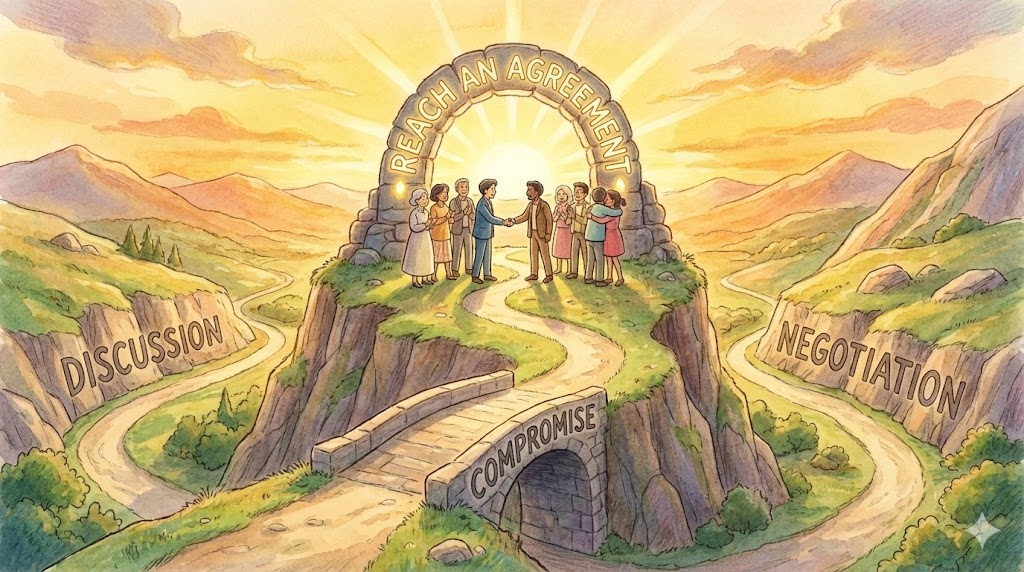- 해석: 협상이나 토론 끝에 서로 의견을 일치시켜 결론을 맺는 것입니다.