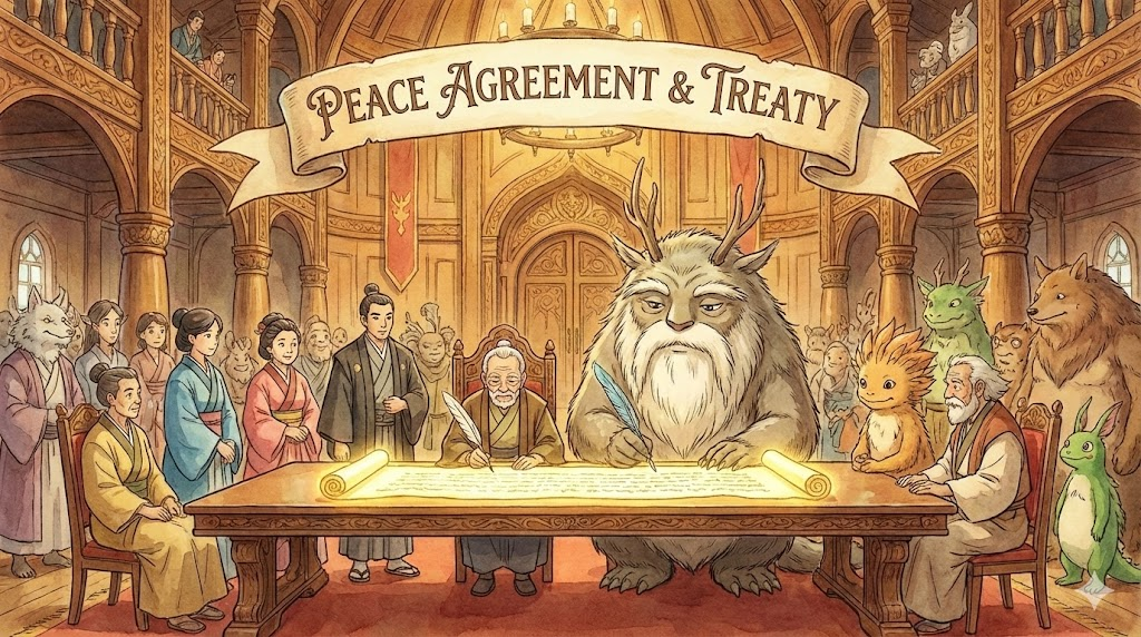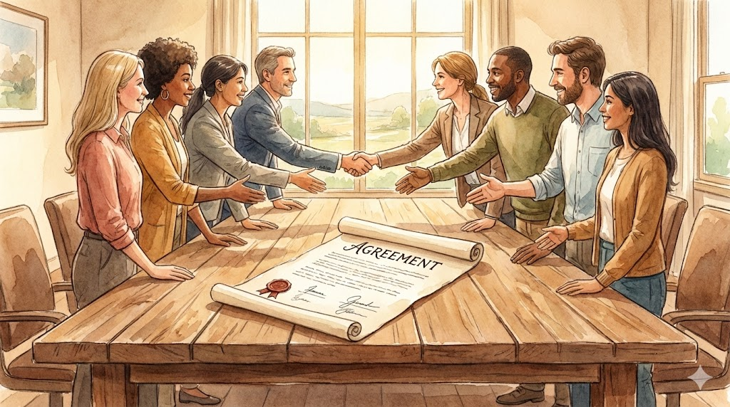 | 종합 뉘앙스 | (1) 의견이나 감정이 서로 맞아 충돌이 없는 상태. (2) 그 결과로 맺어진 공식적인 약속이나 문서. | 의견 일치 또는 약속 |