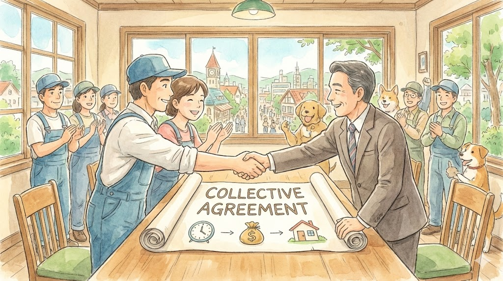 - 예문: The union and the company signed a new collective agreement covering wages and benefits. (노조와 회사는 임금과 복리후생을 다루는 새로운 단체 협약에 서명했다.)