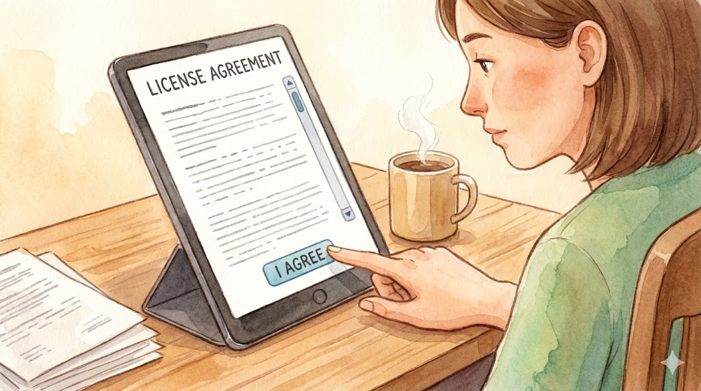 소유자가 다른 사람에게 특허, 상표, 기술, 소프트웨어 등을 사용할 수 있는 권한을 부여하고 그 대가(로열티 등)와 조건을 정하는 계약입니다. 소프트웨어 설치 시 흔히 보는 '최종 사용자 라이선스 계약(EULA)'이 대표적입니다.