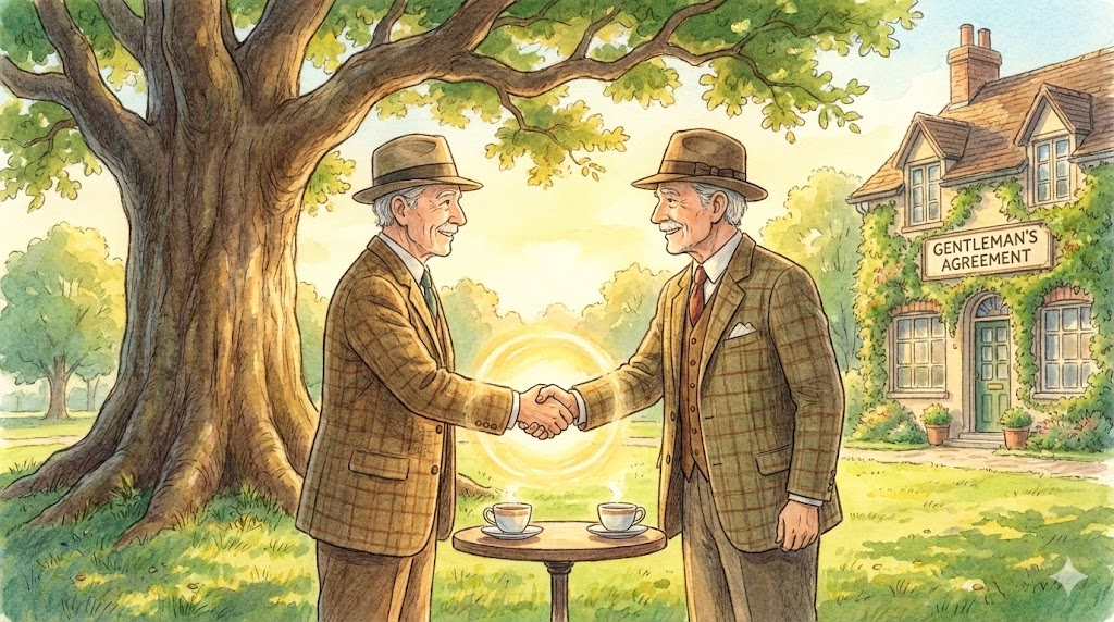 법적인 구속력은 없지만, 당사자 간의 신뢰와 명예를 바탕으로 지키기로 한 비공식적인 약속이나 합의를 의미합니다. 주로 악수로 체결되며, 문서는 작성하지 않는 경우가 많습니다.