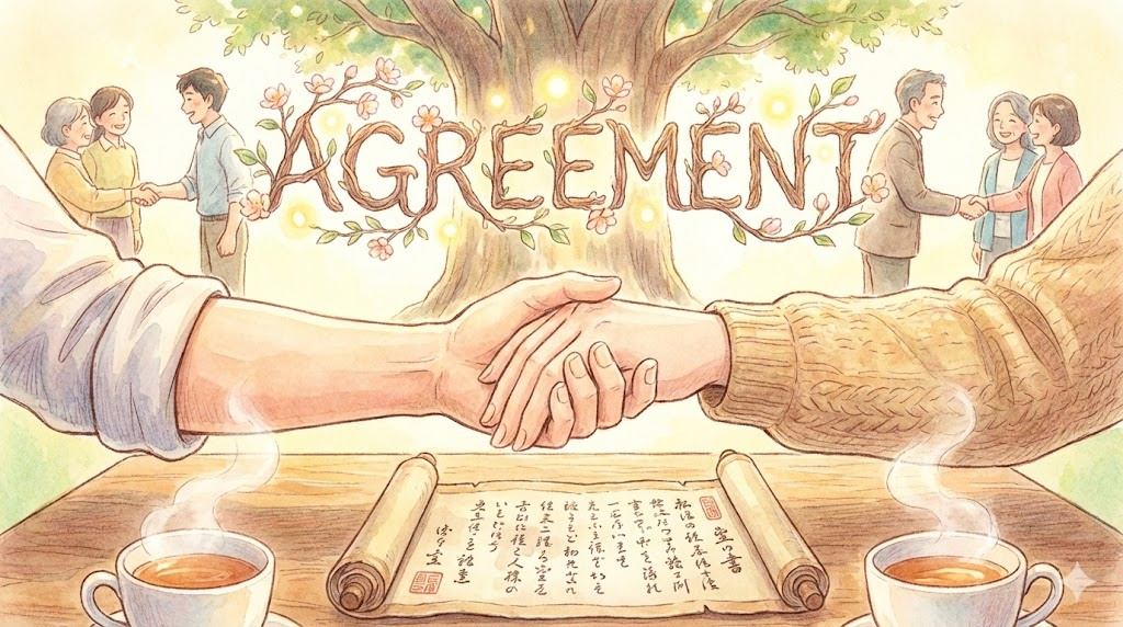 합의, 계약. 의견의 일치, 협상의 결과, 부동산 및 국가 간의 약속.