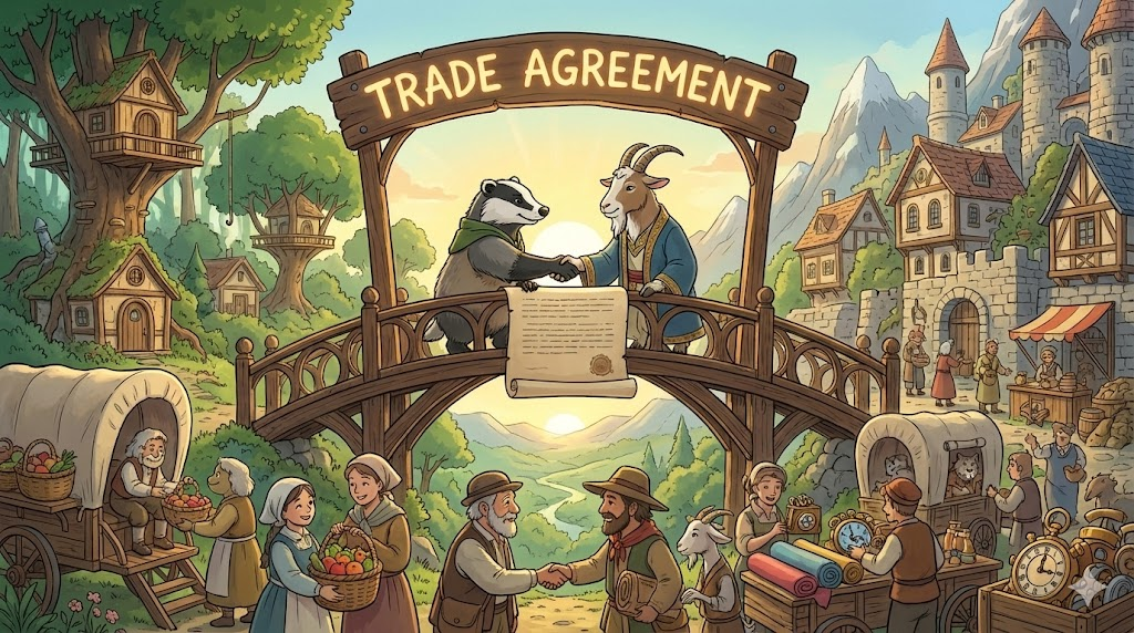 - 해석: 국가 간에 관세를 줄이거나 무역 장벽을 없애기 위해 맺는 공식적인 조약입니다.