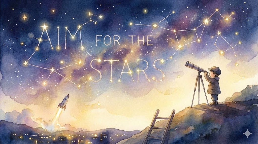 단순히 높은 목표(aim high)를 넘어, 하늘에 있는 별을 따려는 것처럼 아주 원대하고 불가능해 보일 정도로 큰 꿈을 꾸라는 격려의 표현입니다. "꿈은 크게 가져라"라는 뜻입니다.